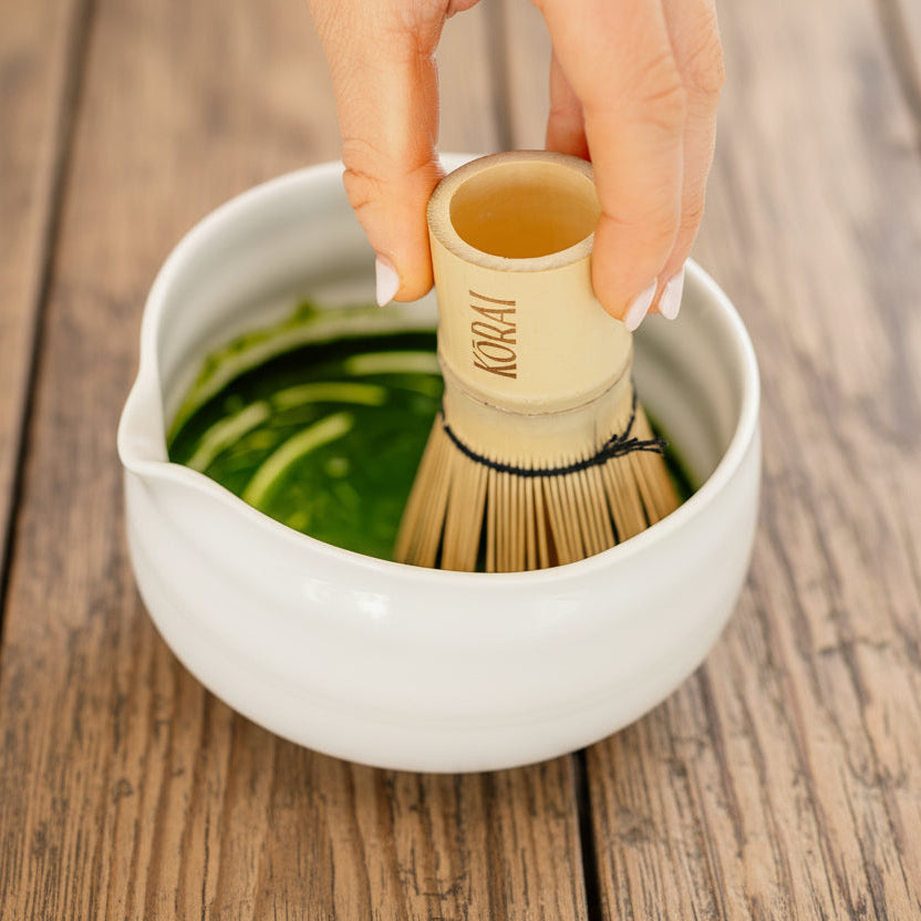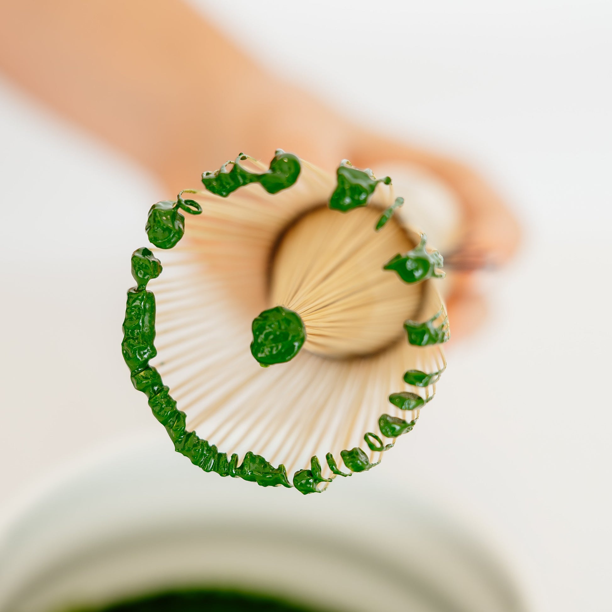 Gracias a su diseño, el matcha se integra mejor, se oxigena ligeramente y se consigue una textura cremosa con una espuma ligera que caracteriza a un buen matcha.